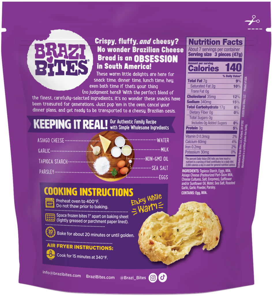 If you like garlic bread, you’ll love our Garlic Brazilian Cheese Bread. Freshly grated Asiago cheese provides the perfect rich & nutty flavor. Enjoy as a dinner roll, snack or appetizer.