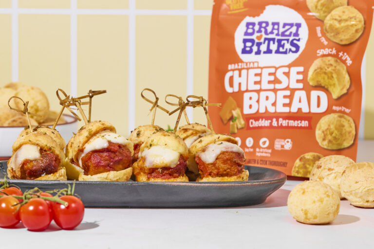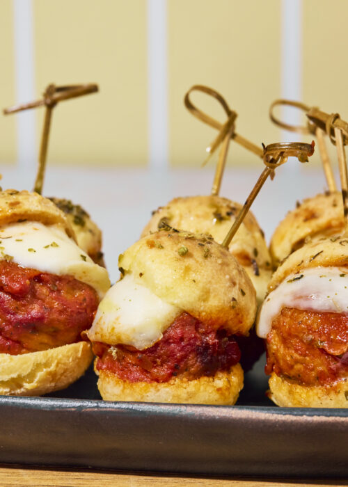 Put a sauced meatball in each "brazi bun" and add a mozzarella slice to the top of the meatball. Hold it all together with a skewer.
